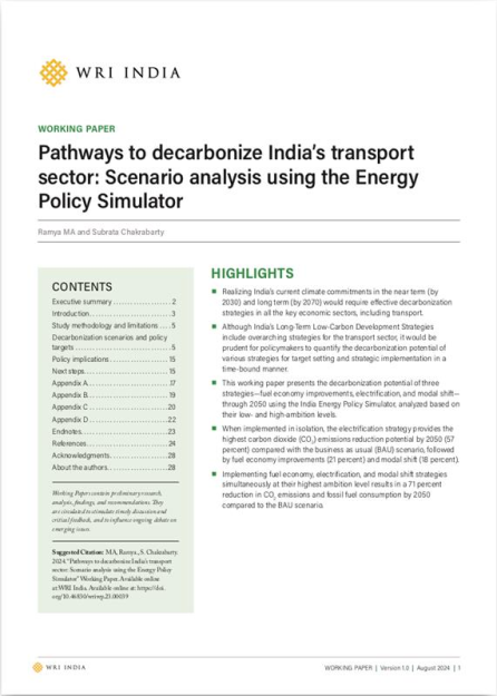 India aims to reduce its emissions intensity of GDP by 45% from 2005 levels by 2030 and achieve net zero by 2070, with a target of 50% non‑fossil power capacity by 2030. However, the transport sector, which accounted for 14% of energy‑related CO₂ emissions in 2020, lacks an emissions reduction roadmap. This working paper presents an integrated assessment of decarbonization strategies—electrification, fuel efficiency improvements, and modal shift—using the India Energy Policy Simulator.