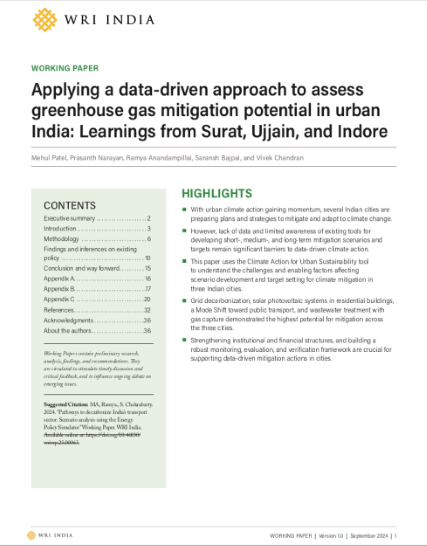 Learnings from Surat, Ujjain, and Indore: This paper highlights key strategies for reducing greenhouse gas (GHG) emissions in urban areas. It recommends strengthening institutional frameworks and data collection mechanisms to help Indian cities effectively meet their climate targets.