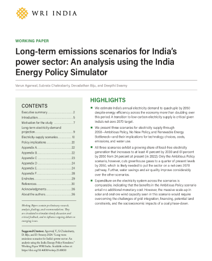 India aims to achieve 50 percent of its installed electricity capacity from non-fossil sources by 2030, requiring significant capacity expansion. Despite this, coal is expected to remain dominant in the near term. This working paper explores three power sector transition scenarios using the India Energy Policy Simulator, analyzing emissions, investments, and technology mix to inform long-term decarbonization pathways.