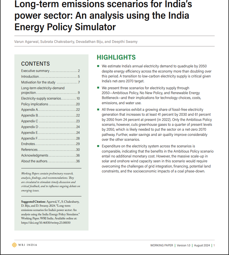 India aims to achieve 50 percent of its installed electricity capacity from non-fossil sources by 2030, requiring significant capacity expansion. Despite this, coal is expected to remain dominant in the near term. This working paper explores three power sector transition scenarios using the India Energy Policy Simulator, analyzing emissions, investments, and technology mix to inform long-term decarbonization pathways.